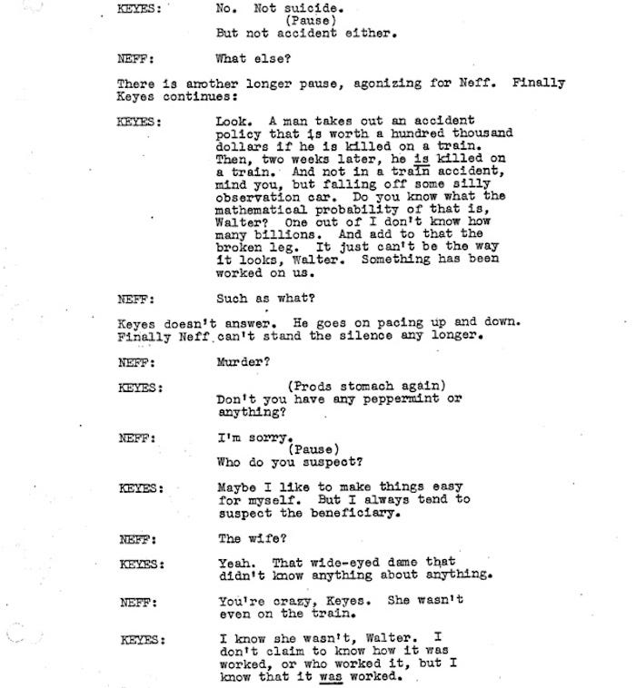 A key scene from the classic 1944 thriller Double Indemnity, screenplay by Billy Wilder and Raymond Chandler, novel by James M. Cain.
